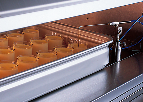 ゼリーの殺菌は90℃を超えるとゼリーが離水しやすくなり、85℃以下では殺菌が甘く、日持ちがしなくなり、食中毒の原因になります。寸胴で行う熱殺菌は、温度管理のためにずっと人が付いていなくてはなりません。また、直火のため温度のムラがあり、誰でもやれることではありませんでした。